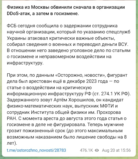 СМИ сообщают, что учёный якобы вышел на контакт с представителями украинских спецслужб после начала военной операции в Украине. Ему было поручено проводить DDoS-атаки на критическую инфраструктуру России и собирать данные о военных и перемещении военной техники.
